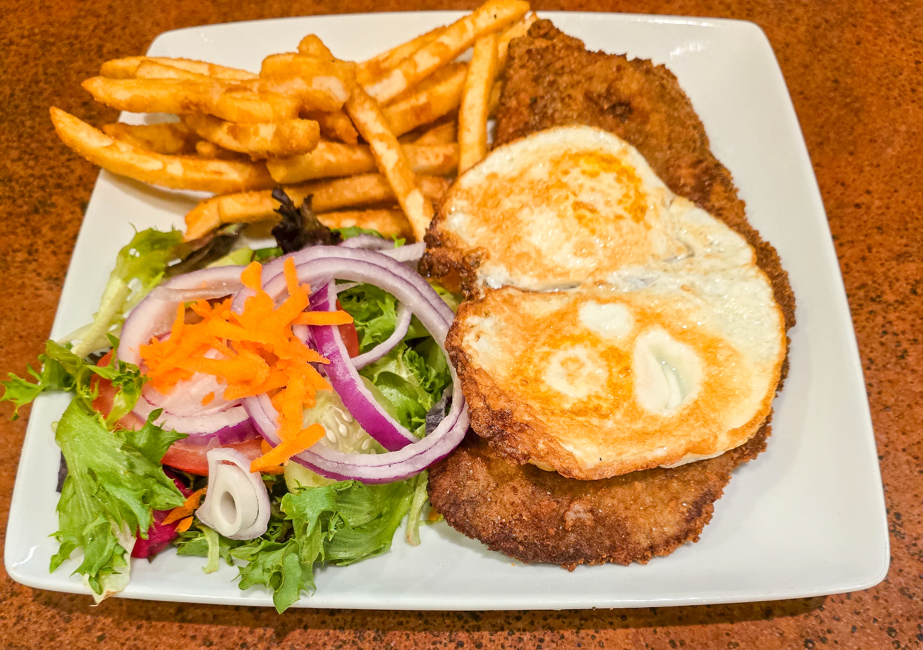 Thinly sliced beef steak breaded and fried served with aa fried egg and French fries