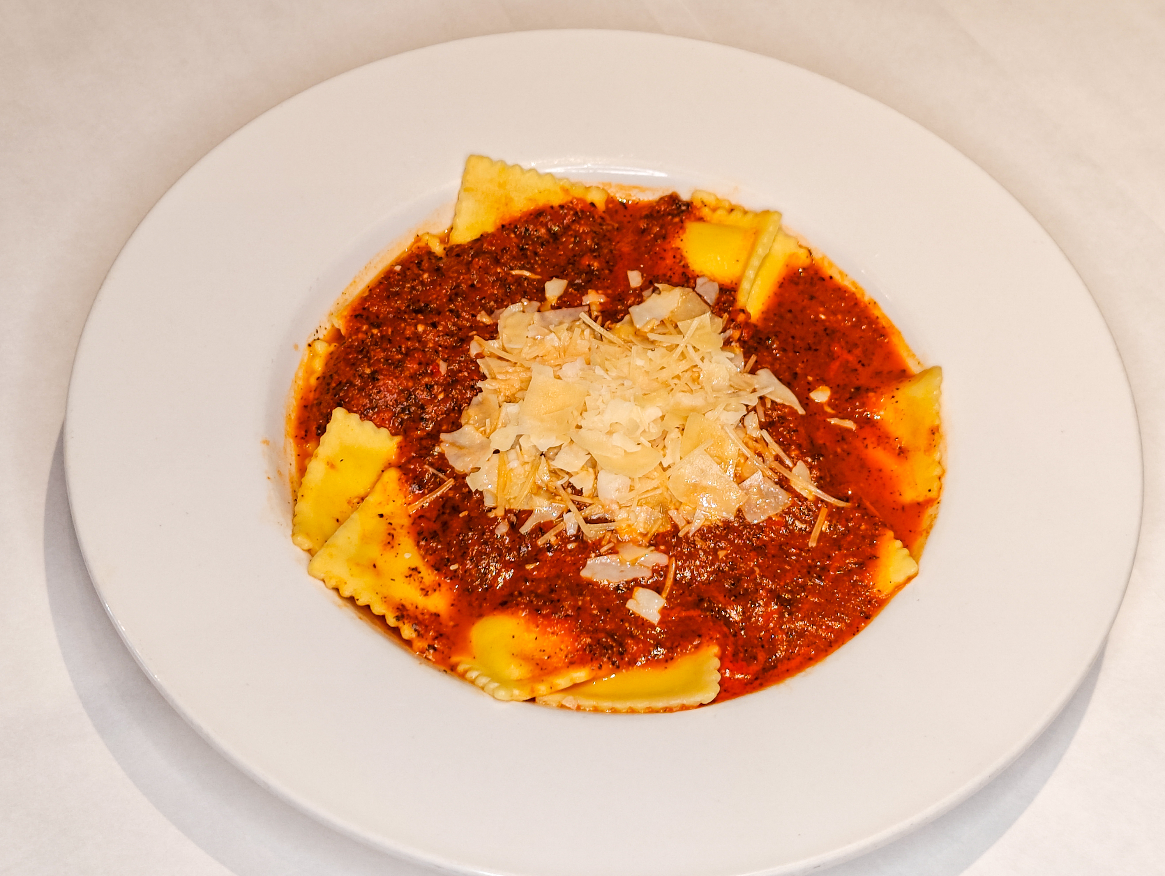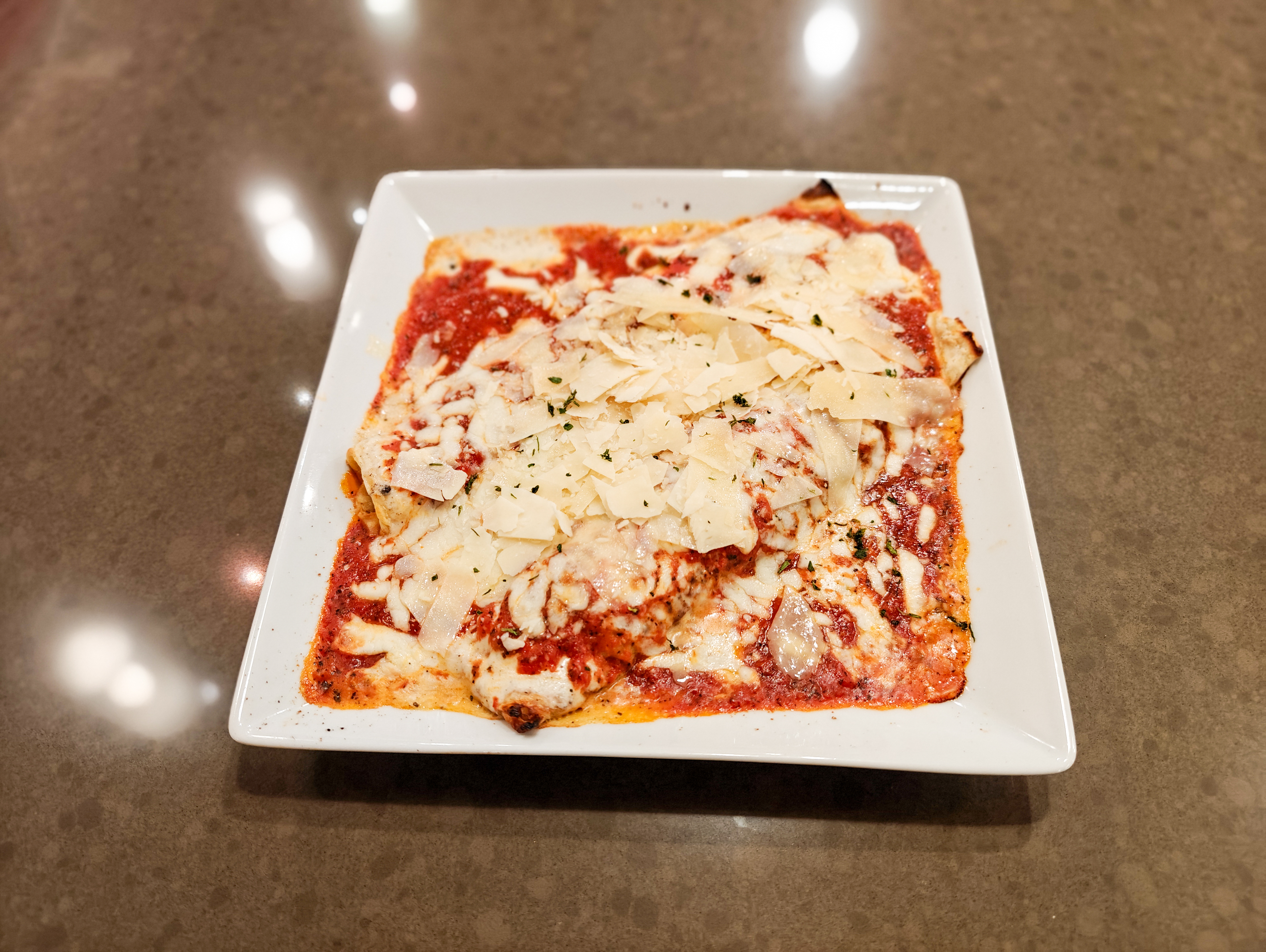 Cannelloni crepe pasta filled with bechamel sauce and ground beef. Baked in homemade Pomodoro sauce and mozzarella.